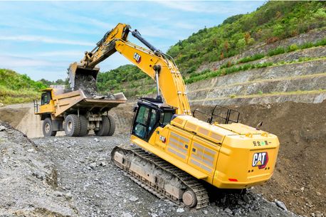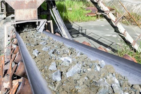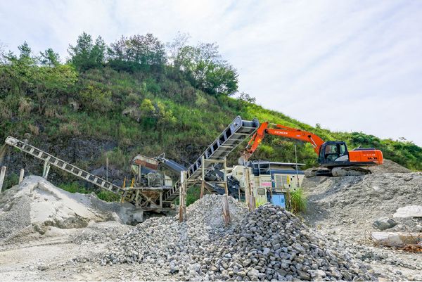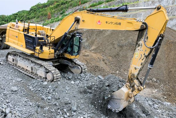 発破によって破砕した箇所の岩石を大型バックホーで掘削し、原石を採取します。原石は重ダンプに積み込んで移動式破砕機まで運搬し、投入口(ホッパー)に投入します。