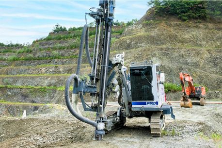 製品の原料となる原石を採取するため、火薬を用いて岩盤を砕きます。クローラドリルで岩盤に穴を開ける作業を「穿孔(せんこう)」、その穴に火薬を装填して点火、破砕することを「発破(はっぱ)」と言います。